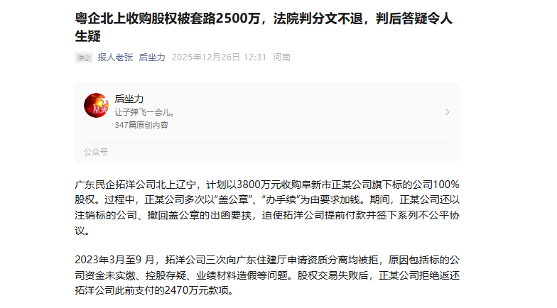 粤企北上收购股权被套路2500万,法院判分文不退,判后答疑令人生疑