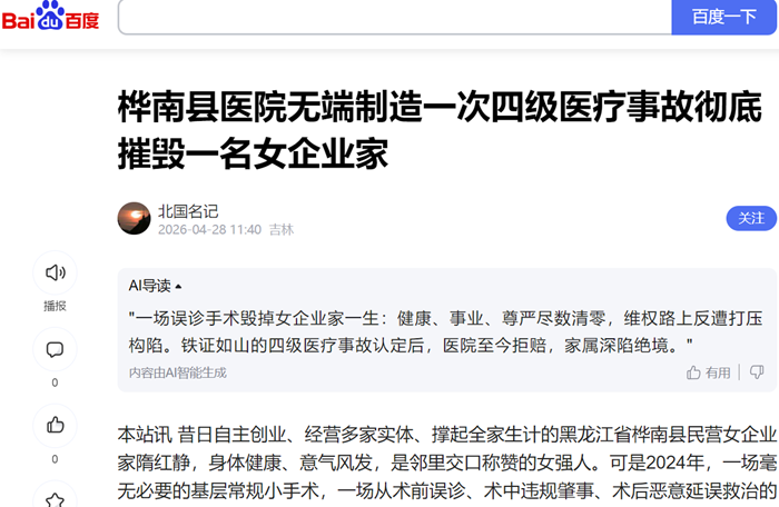 本站讯 昔日自主创业、经营多家实体、撑起全家生计的黑龙江省桦南县民营女企业家隋红静,身体健康、意气风发,是邻里交口称赞的女强人。可是2024年,一场毫无必要的基层常规小手术,一场从术前误诊、术中违规肇事、术后恶意延误救治的全链条医疗事故,让桦南县人民医院彻底改写了她人生轨迹。权威医疗鉴定实锤四级医疗事故,院方被裁定承担全部全责,铁证面前医院始终拒不赔付善后。更令人寒心的是,受害者依法逐级合理信访维权,其诉求非但无人回应、合理赔偿迟迟落空,反倒屡遭当地相关部门层层打压牵制,远赴北京正常上访后,无端被扣上非法开采的罪名,身陷取保候审窘境,终日惶惶难安,身心双重重创叠加维权绝境,一个好好的家庭从此坠入深渊。